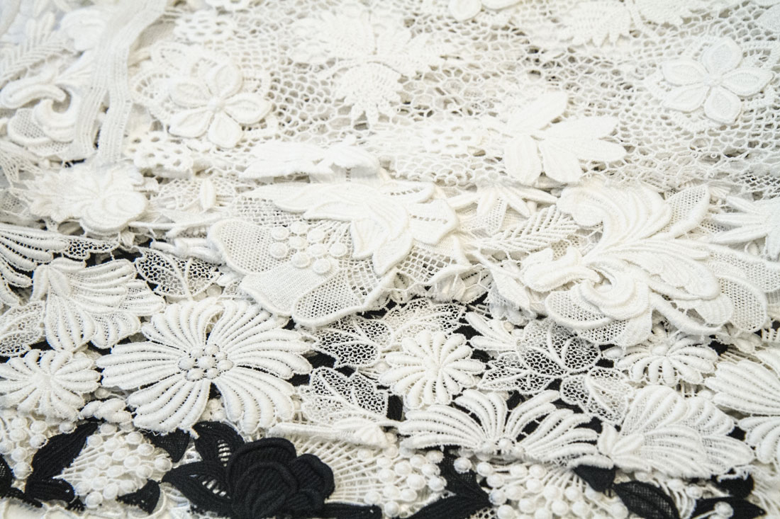 With embroidered lace, a design is embroidered directly onto a base fabric. Within this broader category is the chemical lace material that we used for the Flower Lace techo cover. After embroidery, we place the textile in hot water around 70 to 80 degrees