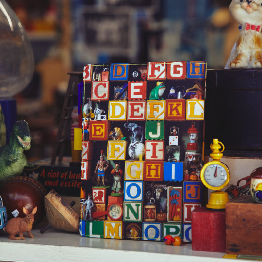 The A5 size Hobonichi Techo cover contains an all-over print of a maze of alphabet blocks. The blocks in the picture are surrounded by unique and charming little objects spaced between them.
