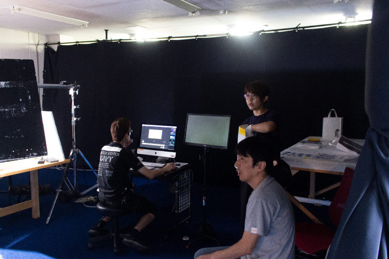 To the front is Goda, to the back-right is Hiramatsu who is in charge of creations, and to the back-left is Sugimoto who is in charge of editing.