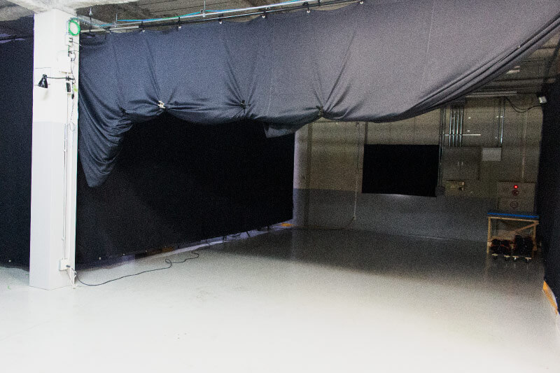 The filming studios are on the first and second floor. The space can be sectioned freely using the black curtains.