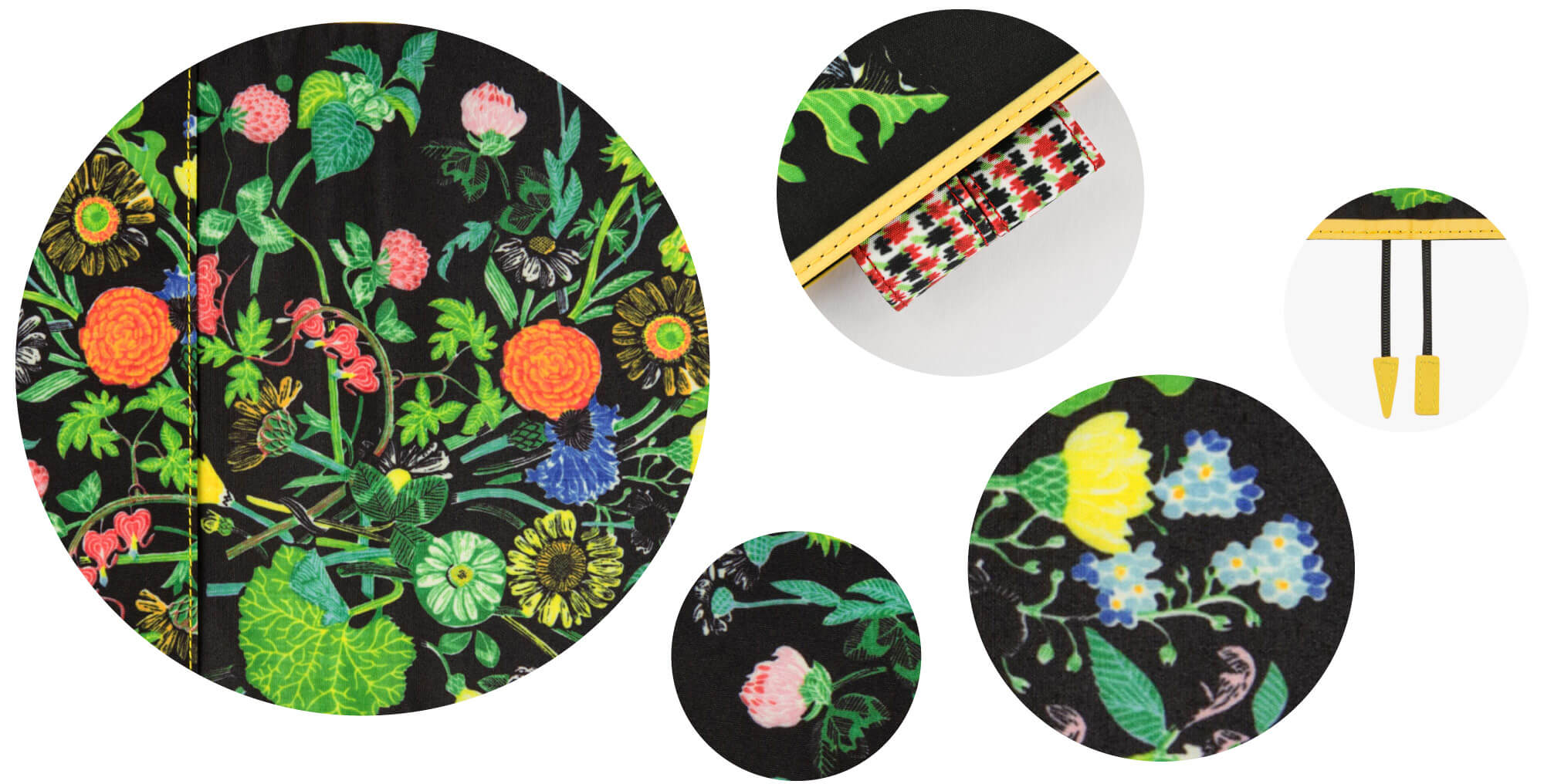 The handkerchief importer and manufacturer Blooming Nakanishi provided this gorgeous image from their extensive collection. The intricately printed handkerchief pictured on this techo cover was originally made in Switzerland. The black background helps unite the design as it showcases the flowers’ vibrant colors, and the yellow border gives it a wonderful accent. Another vintage handkerchief pattern appears on the pen holders. All these visuals come together to create an incredibly charming techo cover.