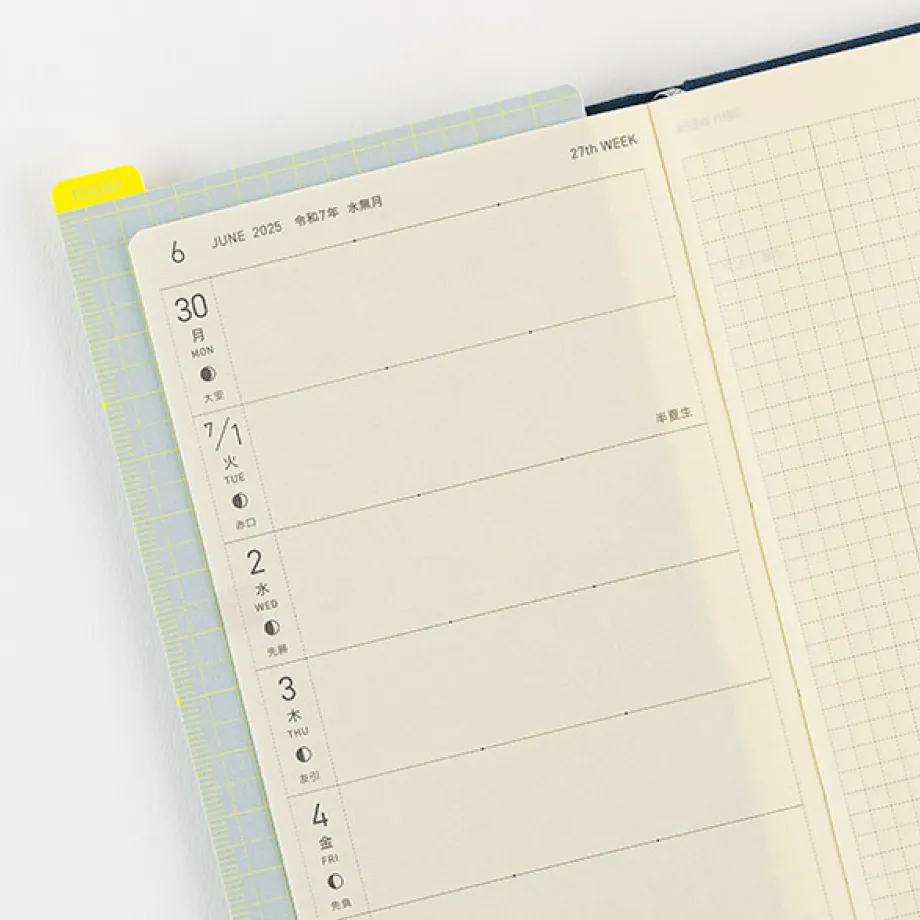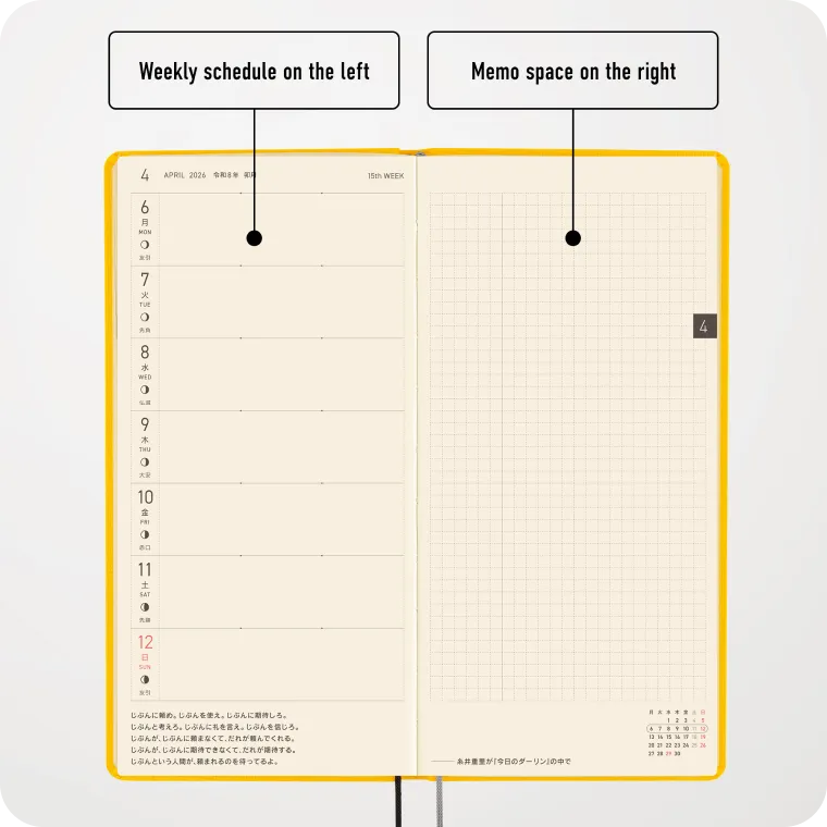 The Hobonichi Techo Weeks is a slim, easy-to-carry planner with a weekly horizontal schedule layout. The main pages follow a “Weekly Schedule + Memo” format, making it simple to keep track of your plans while providing more writing space than meets the eye.