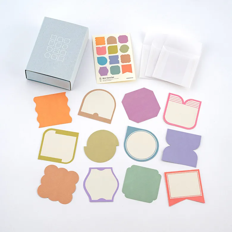 This set includes 12 unique card shapes, with two of each design. It also comes with a sheet of matching sealing stickers and six translucent envelopes, all packaged in a sleeve-style box.
