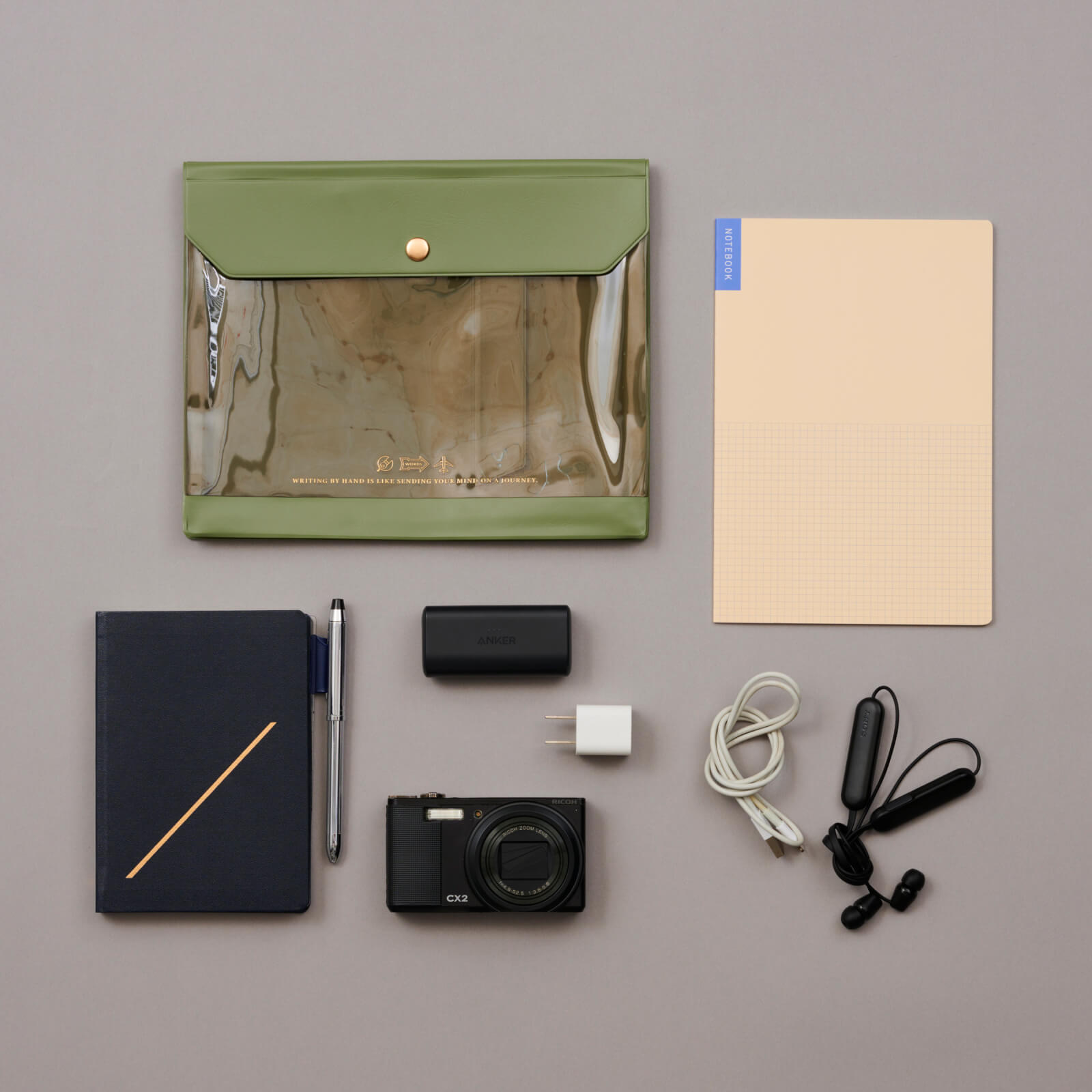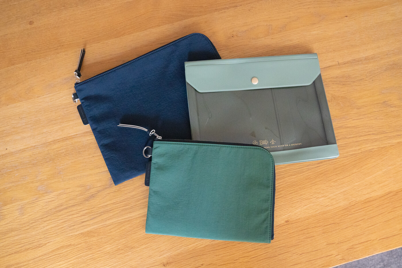 My best options so far are the olive Alettone Document Case, the green A6 size Tragen Flat Pouch, and the black A5 size Tragen Flat Pouch. One is for keeping as many pens as possible, another is for carrying items with my HON and computer, and the A6 size one is for keeping my daily items in my bag.