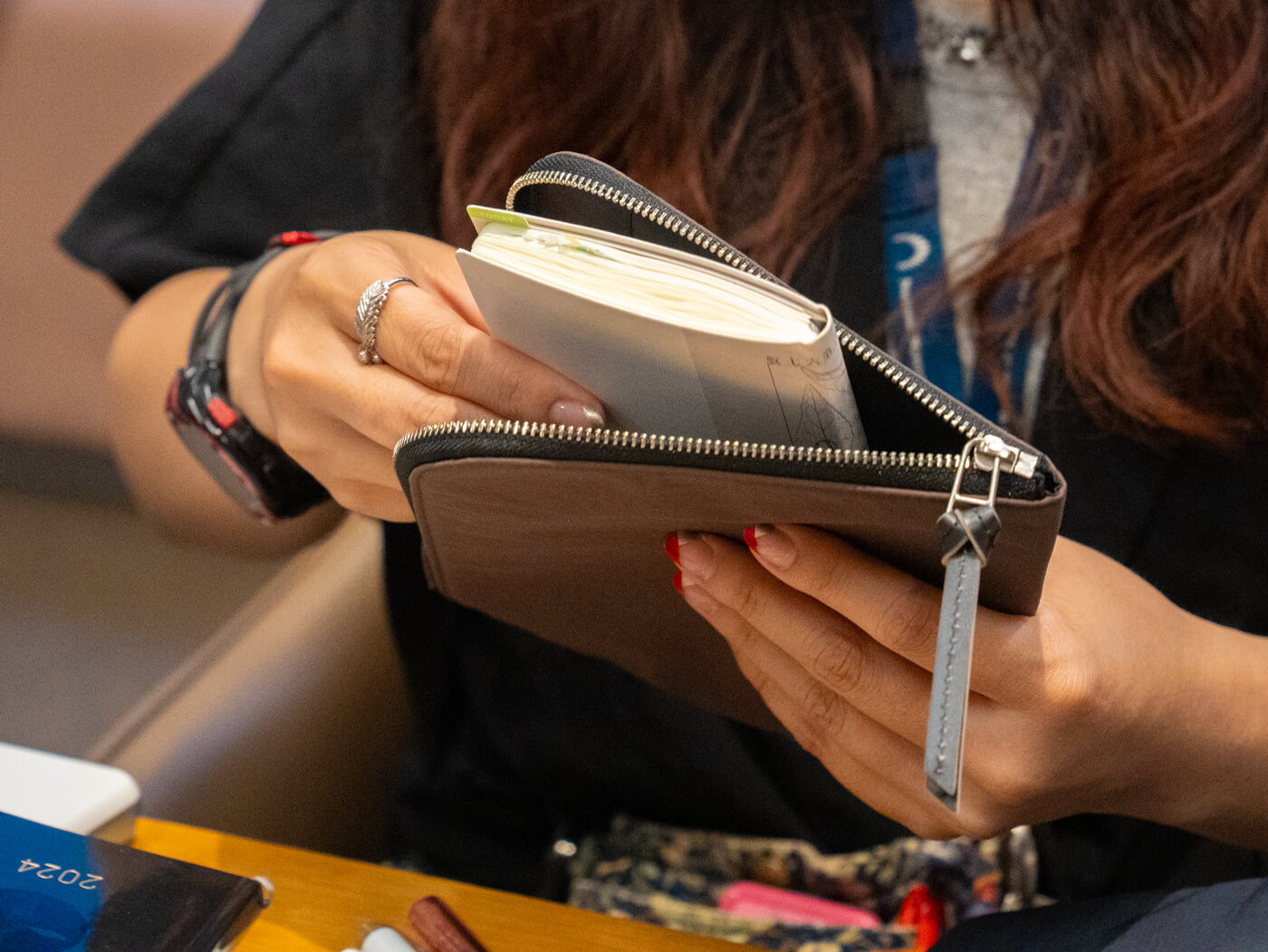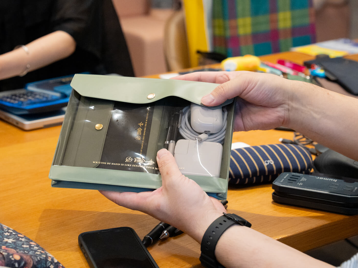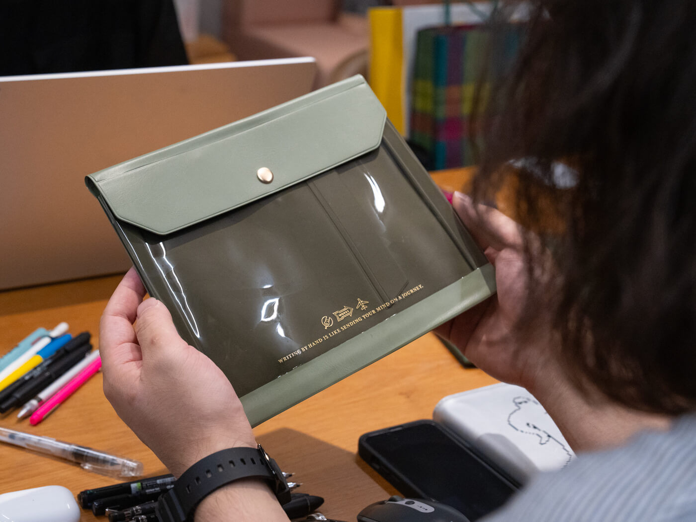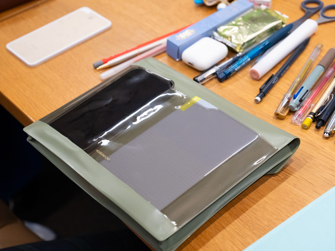 We made it to match the PVC-made Alettone techo covers that debuted in the Hobonichi Techo 2025. The essential part of the size and specifications was the ability to carry the HON book inside. We made the pocket translucent and a flap inside the case.