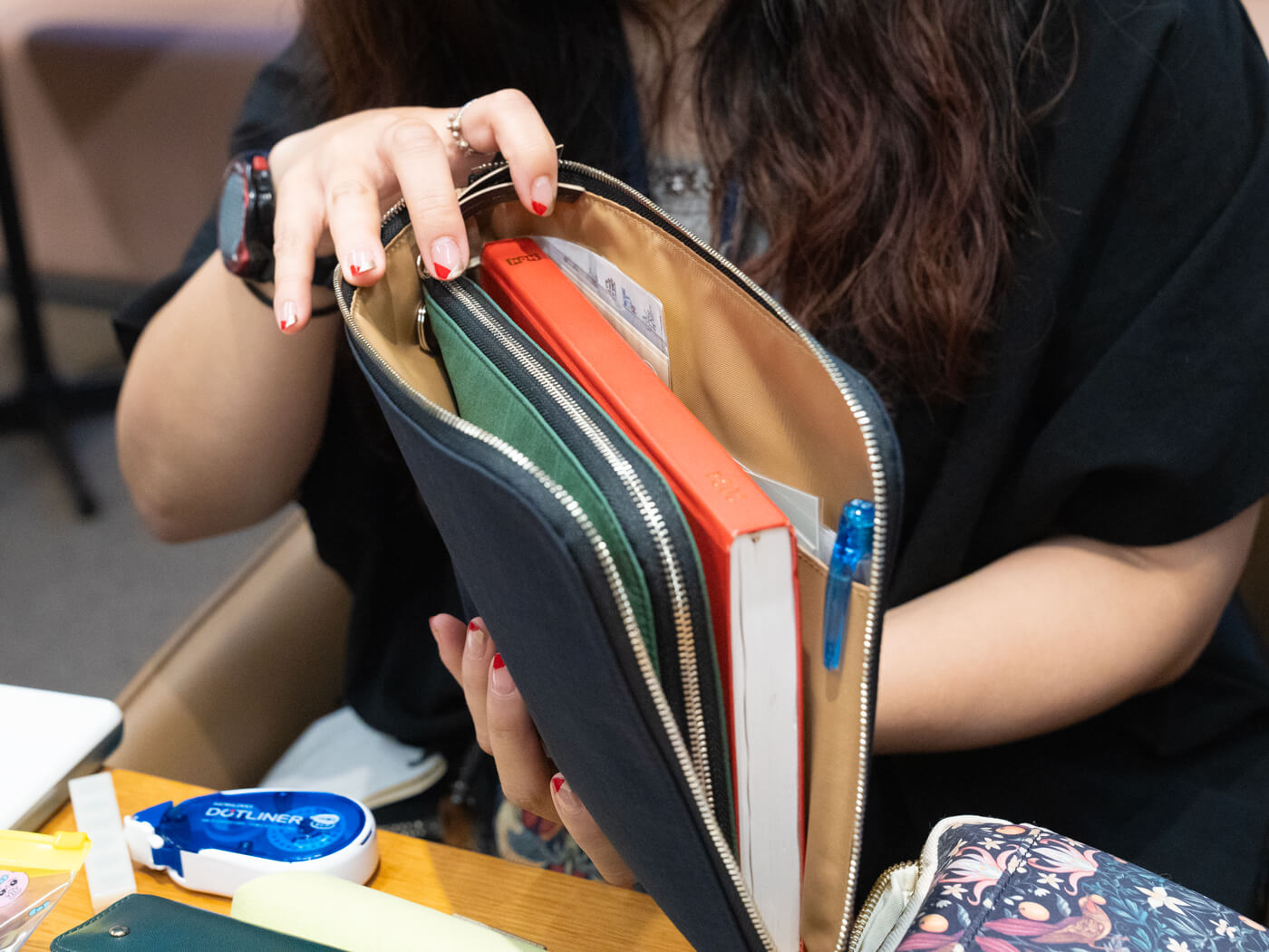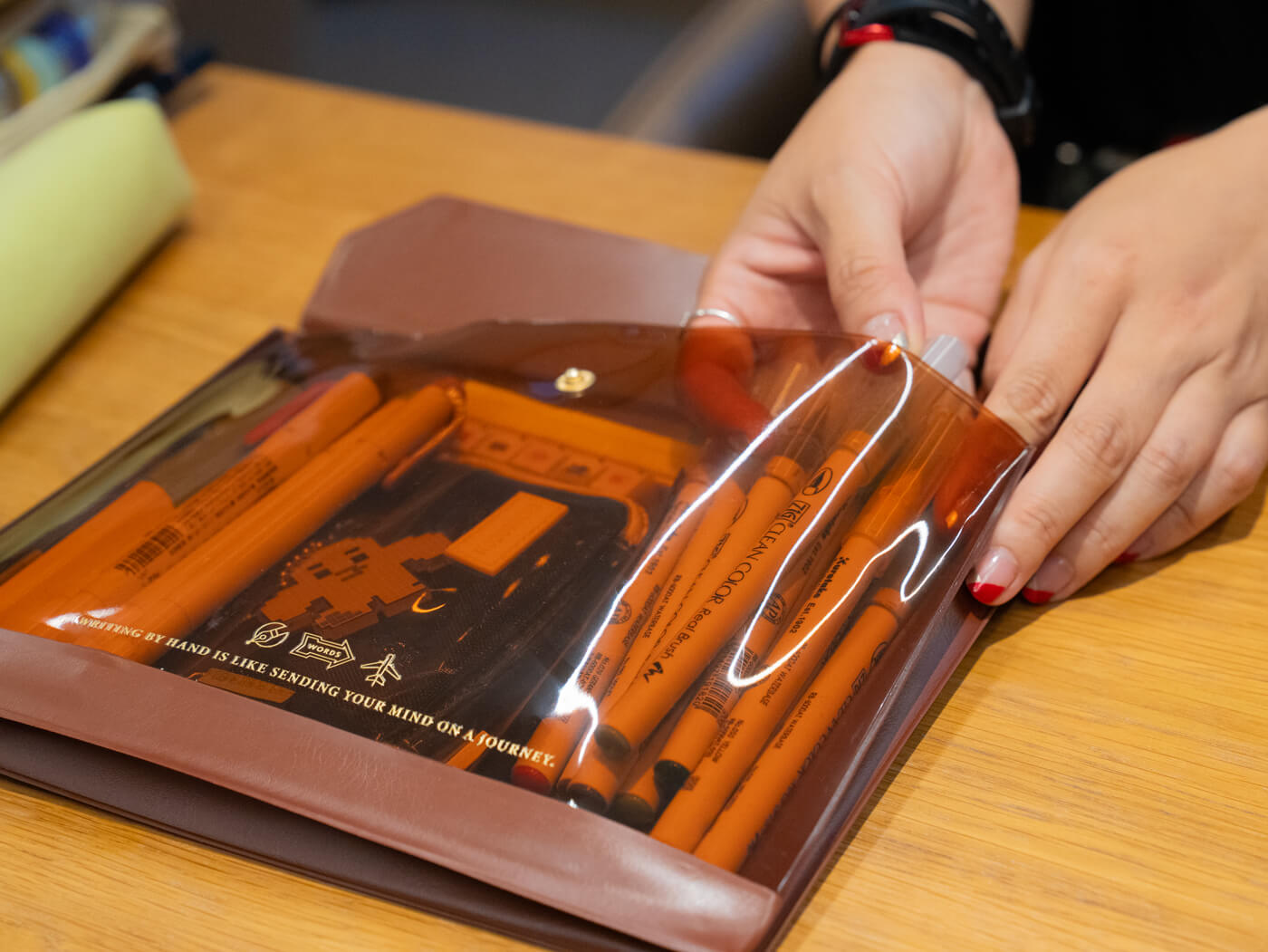 We recommend this two-pouch approach to users who like to carry around a lot of different types and colors of pens. By using one large and one small pouch, you can store an A5 size HON as well as pens and other various utensils.