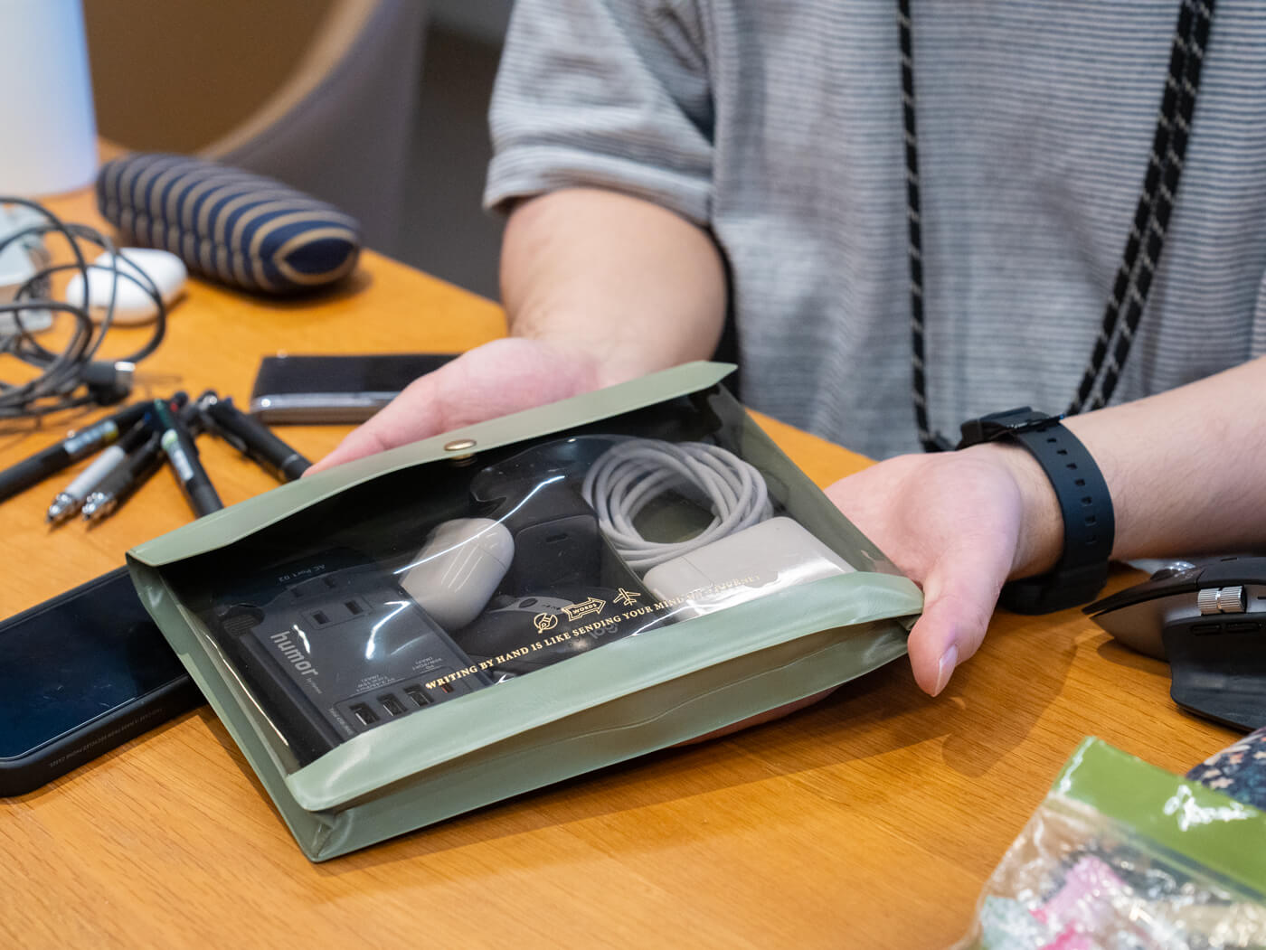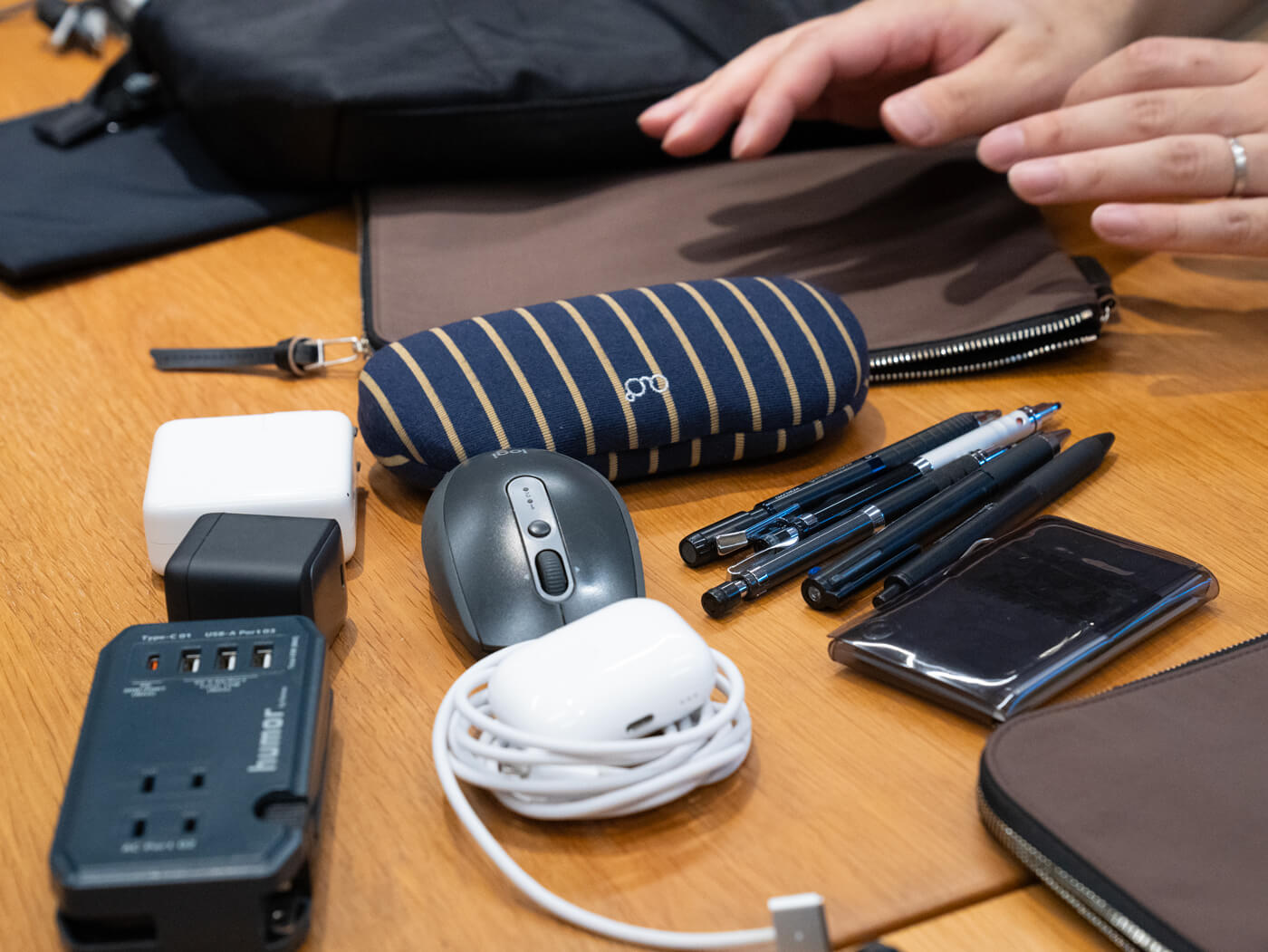It’s my gadget set. I put in the things I always have with me. With this and my computer, I can go straight to work. They fit in very well.