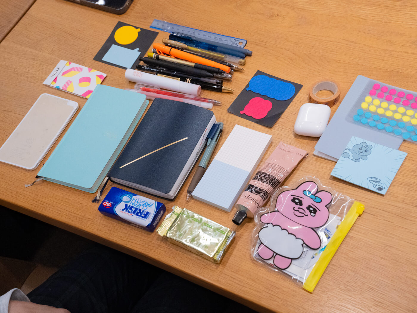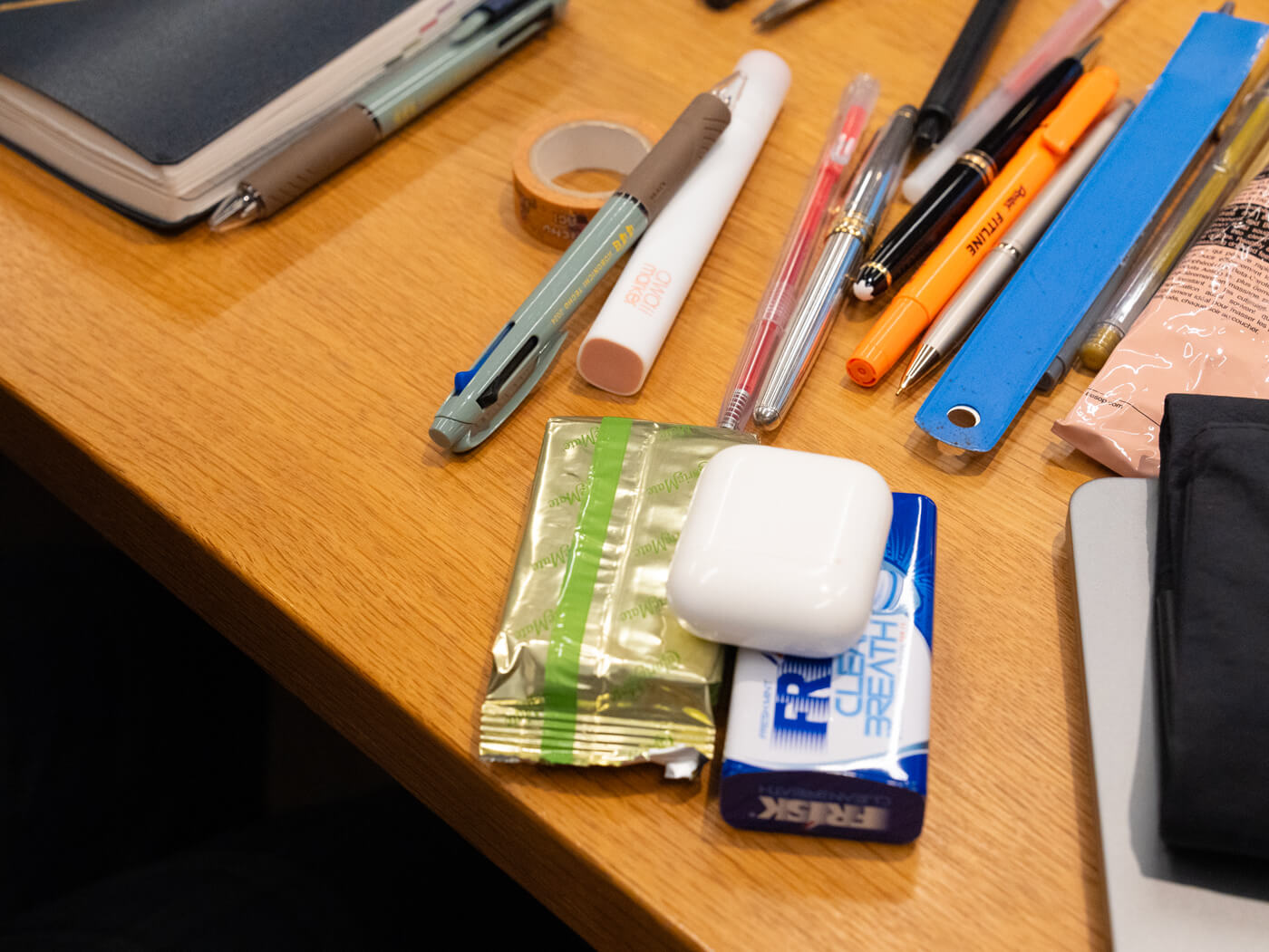 Mine has three pens, washi tape, a Frisk, and a CalorieMate.