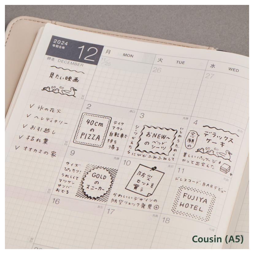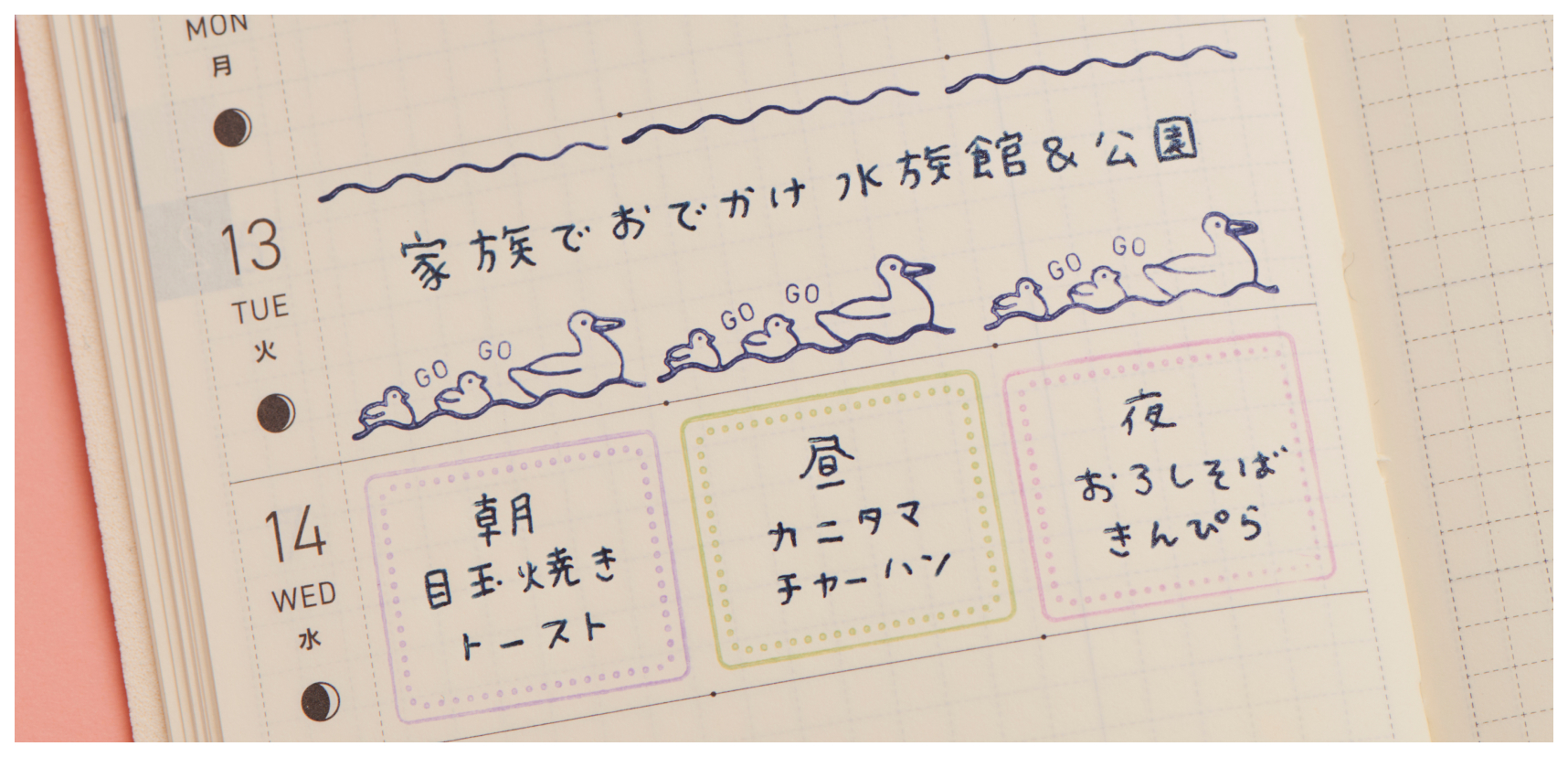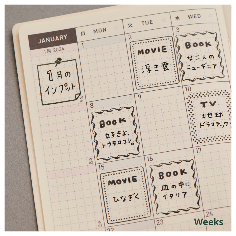 Stamps are a fun, easy way to add personality to your techo. The Hobonichi Techo 2025 introduces a new range of adorable yet practical stamp designs. We tried out various combinations of these stamps on monthly calendars, weekly pages, and daily pages. With just a few stamps, you can make your pages look chic or cute with ease!