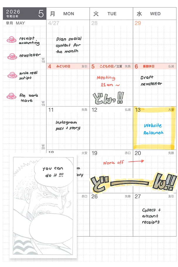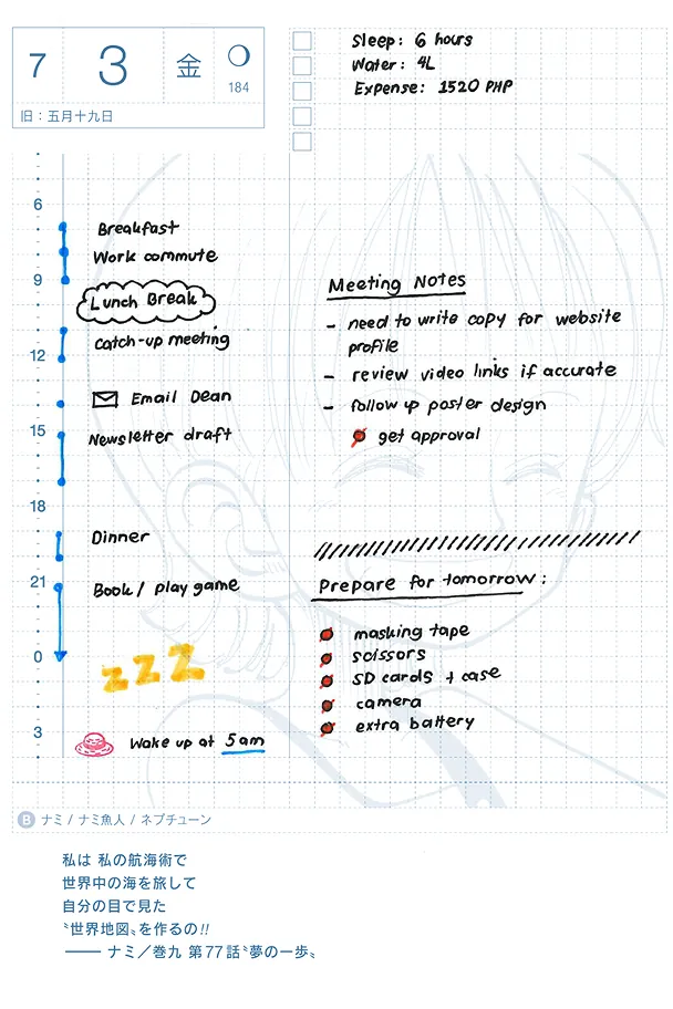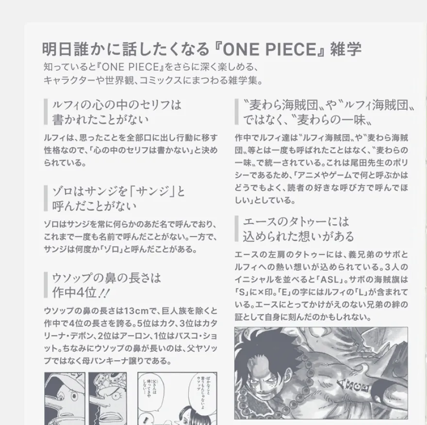 This special edition techo features the user-friendly Hobonichi format filled with original art and memorable quotes from One Piece . As you read the words exchanged by its unforgettable characters, you can record your own life log in these pages.