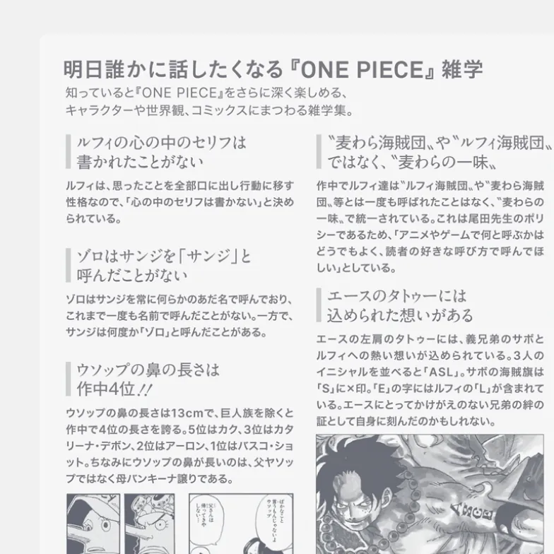 Chats that are exchanged between comrades and friends. Conversations between parent and child, spouses and siblings. Words that are slung at each other between rivals and enemies. Exchanges in a teacher-student or master-servant relationship. Words born from all kinds of relationships within the One Piece manga that takes place between Vol. 1 and 110 are meticulously selected and printed onto the daily page spreads.