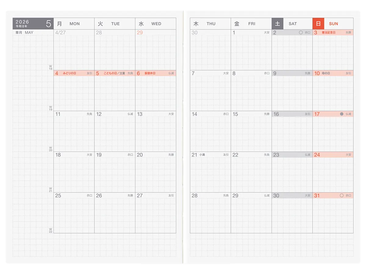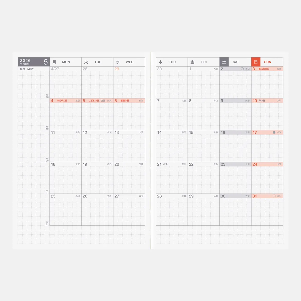 A light grid is printed over the entire page, making it easy to write in appointments and notes. The color scheme is gray and red, a design that offers high visibility even after you’ve written on it.