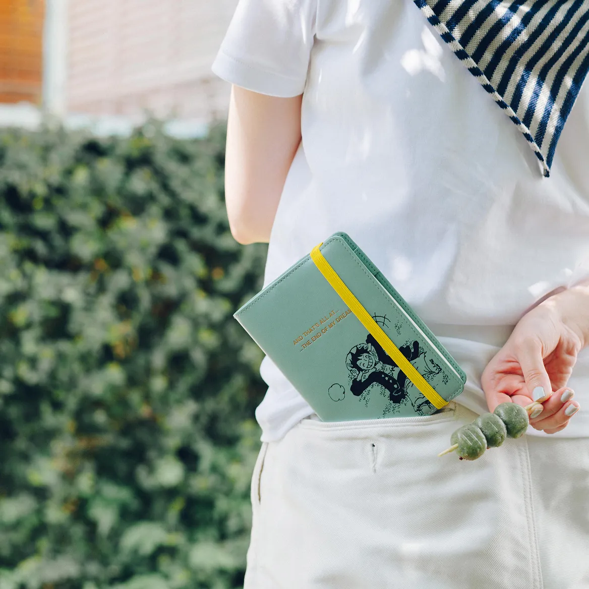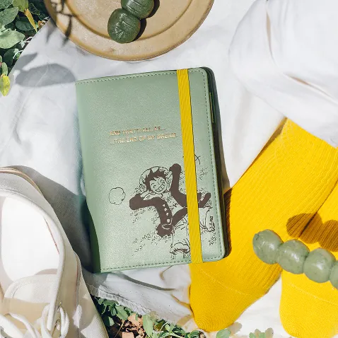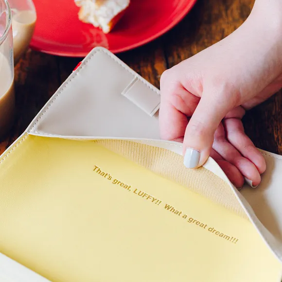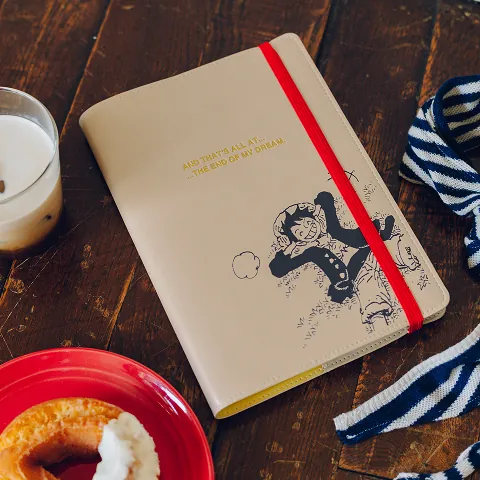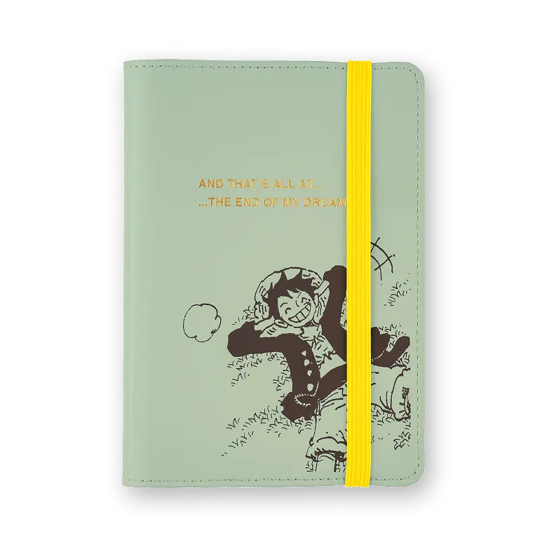 A cover with an elastic band, featuring Luffy lying on the lawn of the Thousand Sunny laughing “Hee Hee Hee!!” It’s designed with the English text of Luffy’s quote from that scene: “And that’s all at... ... the end of my dream”