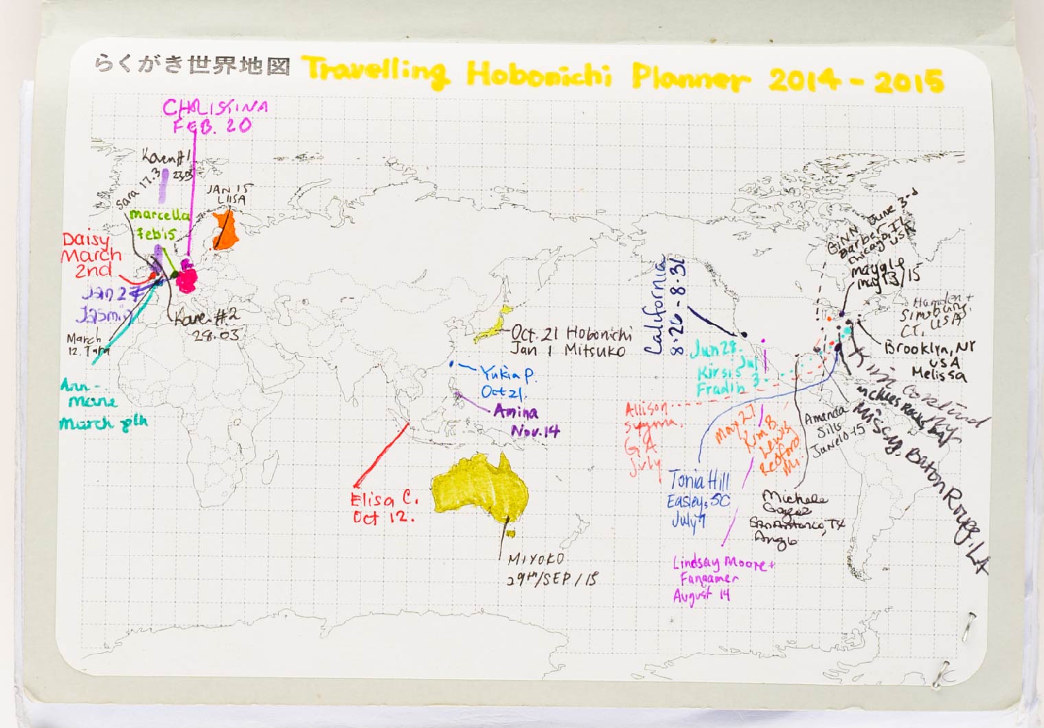 We pasted the World Map from ourDownload City webpageinto the last page of the Traveling Hobonichi so people could fill in their location. The book traveled along the following route: Japan > Finland > Germany > Netherlands > Denmark > Wales > England > Scotland > America > Canada > Australia > Singapore > Taiwan > Philippines > America > Japan
