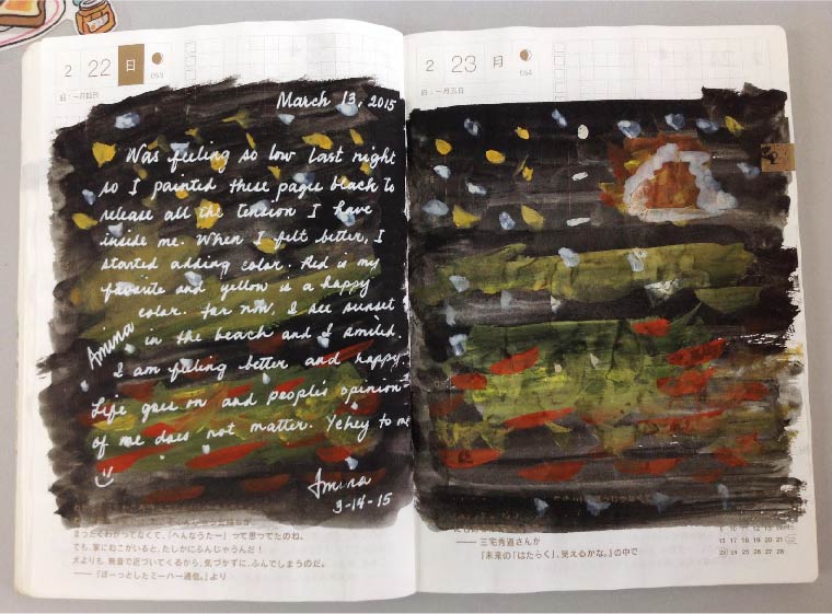 Here’s a photo not of the Traveling Hobonichi, but if Michelle’s personal Hobonichi Techo. She fills it as a journal with anything she likes, such as illustrations and stickers.
