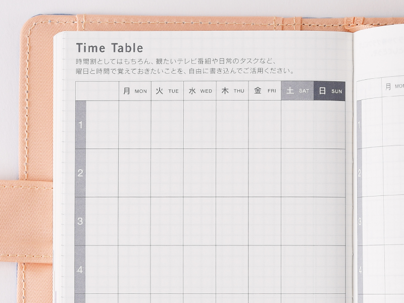 曜日ごとの決まった内容を書いておくことができるタイムテーブルを2つ収録しました。時間割やテレビ番組の放送時間、家事当番の分担など、テーマを決めて使うことができます。