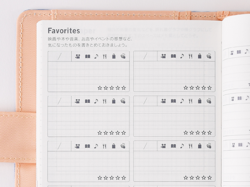 映画、本、音楽、レストラン、買ったものなど、お気に入りのものを書きとめておくページ。5段階の「☆」マークを使えば、自分だけのランキングもつくれます。