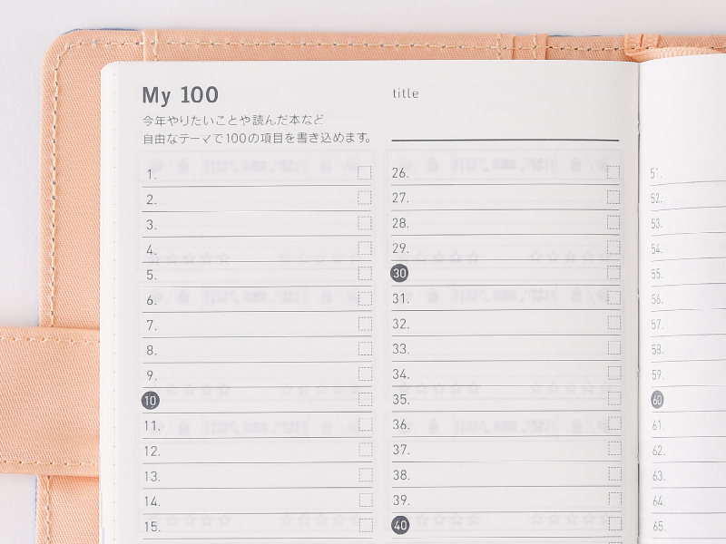 今年やりたいことや、読んだ本、見た映画、食べたおやつ、行きたいお店など、自由なテーマで100のリストをつくれます。