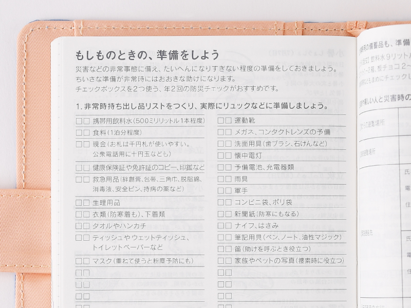 非常時の持ち出し品と、ふだんから備蓄しておきたいものをまとめました。避難場所や緊急連絡先など、家族や親しい人と話し合ったことを書いておけるスペースもあります。