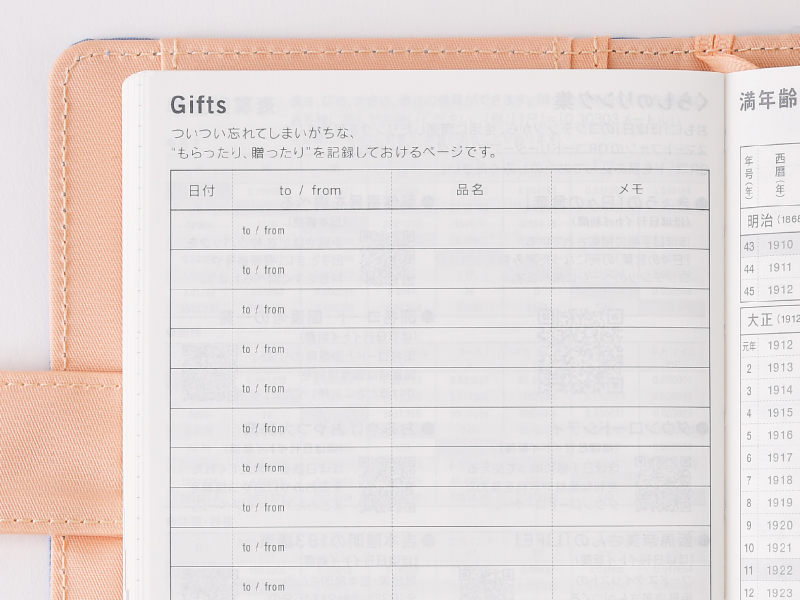 いただいたものや、贈ったものを忘れないようにメモしておくページです。贈り先や贈り主、品名、日付などを17件分書き込むことができます。