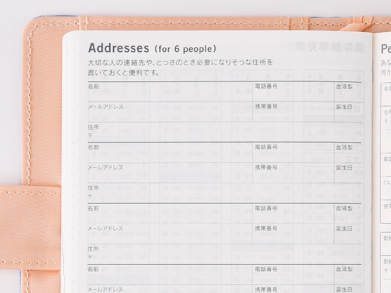 家族や友人の連絡先など、6名分の情報を書いておけるアドレス帳です。