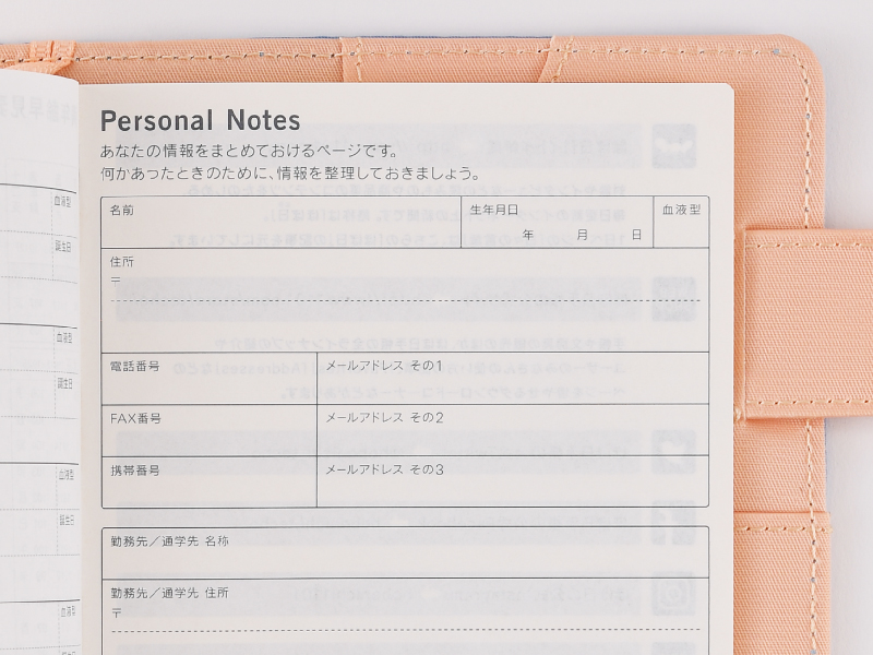 氏名、生年月日、住所、電話番号など自分の情報をまとめて書いておくページです。知られて困るような情報の取り扱いにはご注意を。
