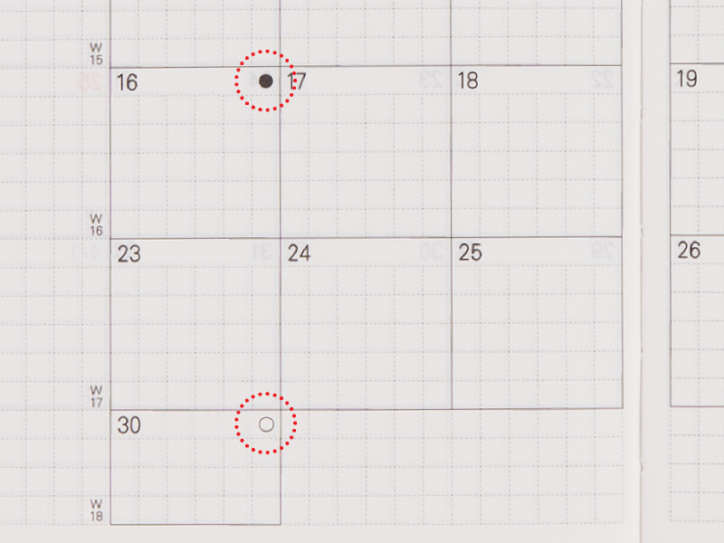 1日ごとに予定などを自由に書きこむことができます。方眼がうすく印刷されているため小さな文字も書きやすく、ボックス内を区切って使いたいときにも便利です。