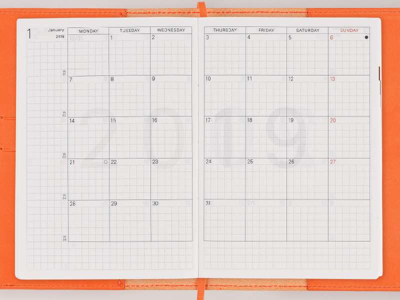 2019年の1~3月の「月間カレンダー」のページには、2018年のものと間違えることがないようにうすめに「2019」と表示しています。