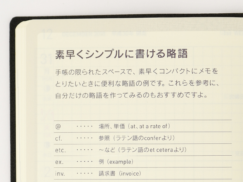 方眼ノートのページの頭に、メモをとるときに便利な略語一覧を掲載しています。短くさっとメモをとりたいときに、お役立てください。