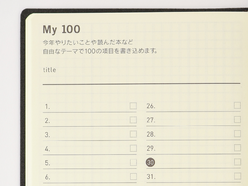 今年やりたいことや、読んだ本、見た映画、食べたおやつ、行きたいお店など、自由なテーマで100のリストをつくれます。