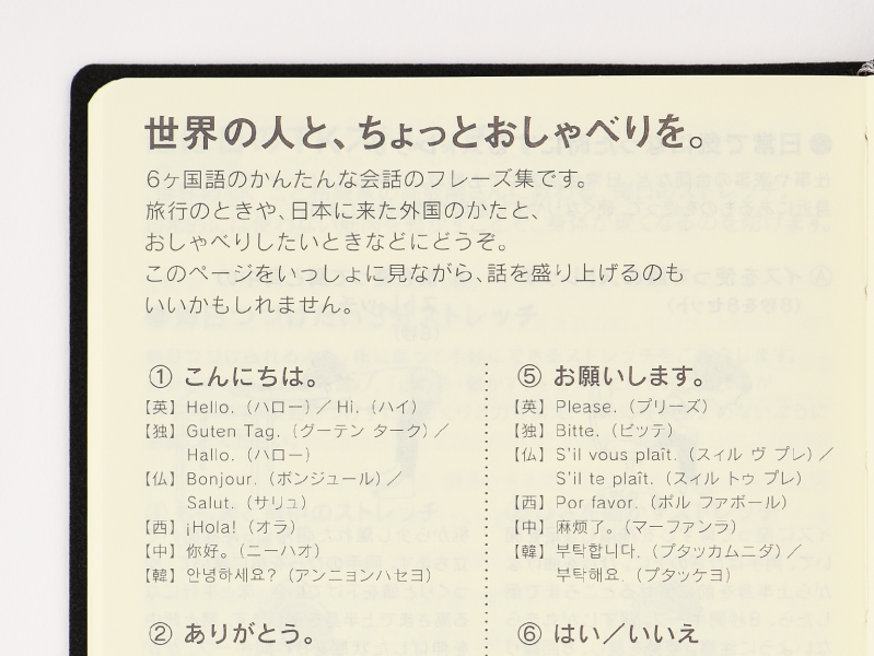日本に来た外国のかたと出会ったときや旅行のときなどに、場をすこし盛り上げてくれる、6ヶ国語のかんたんな会話のフレーズ集です。