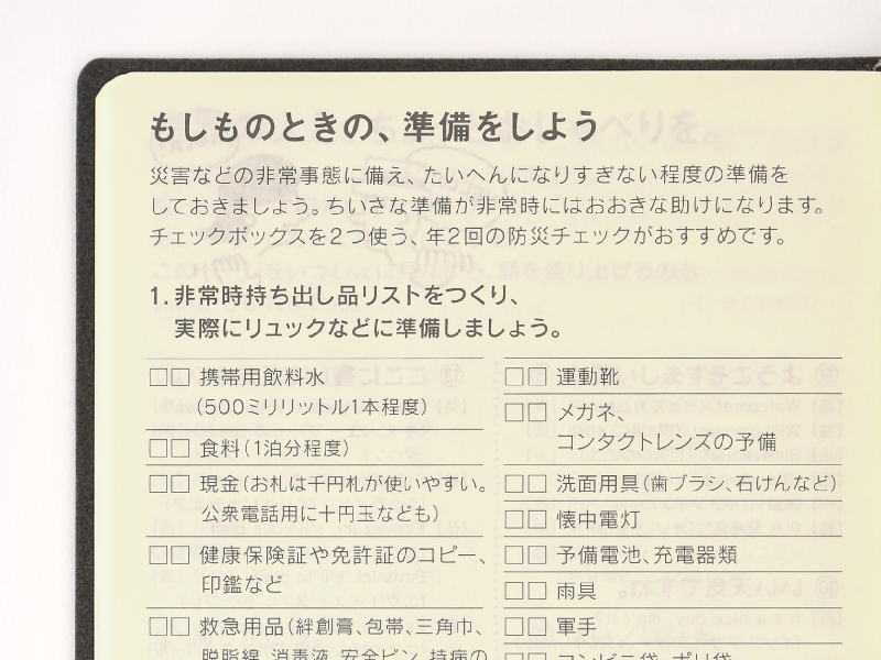 非常時の持ち出し品と、ふだんから備蓄しておきたいものをまとめました。避難場所や緊急連絡先など、家族や親しい人と話し合ったことを書いておけるスペースもあります。
