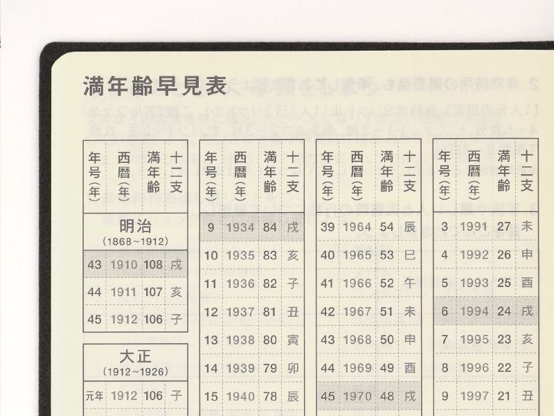 満年齢と十二支が、ひと目でわかる早見表。満年齢0歳から108歳まで掲載しています。2018年の干支である「戌」の行は背景に色を入れ、年男と年女がすぐわかるようにしました。