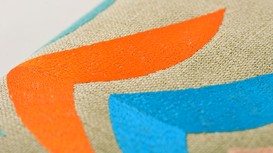 リネンの生地に、ピンクやオレンジ、ブルーなど