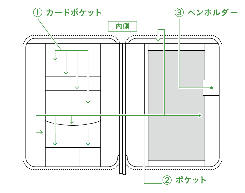 あらかじめご了承ください。- 「外側のポケット」はついていません