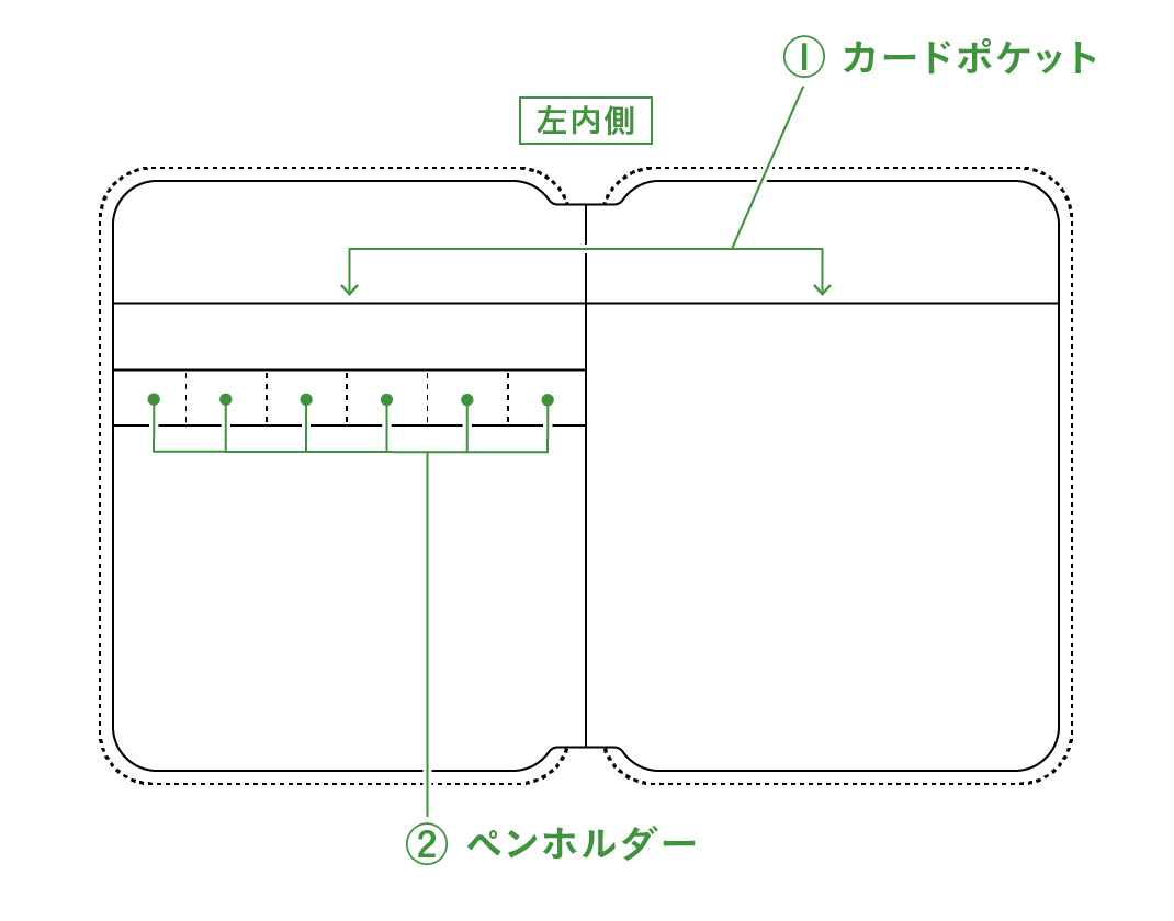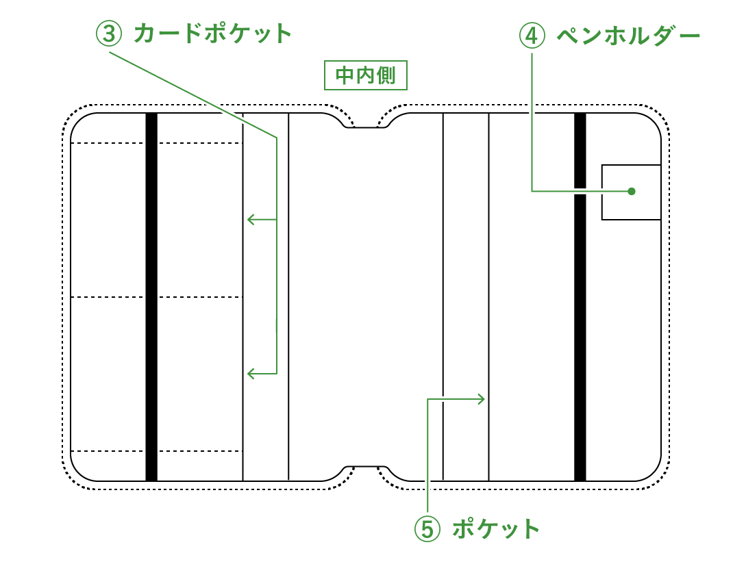 手帳を入れる中央の見開き部分には、