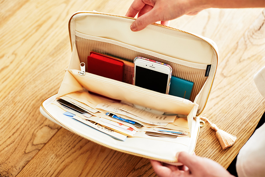 収納すれば、お財布も兼ねたトラベルポーチに。