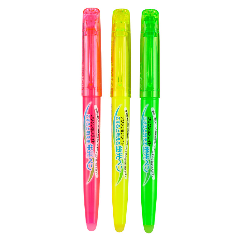 書いた文字を消せる蛍光ペン。イエロー、ピンク、グリーンの3色がセットになっています。