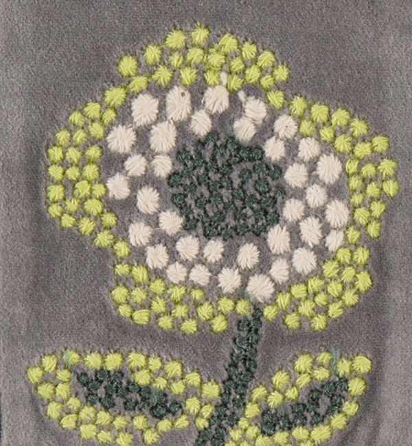 ドットの刺繍の花々が、浮遊するように描かれ、