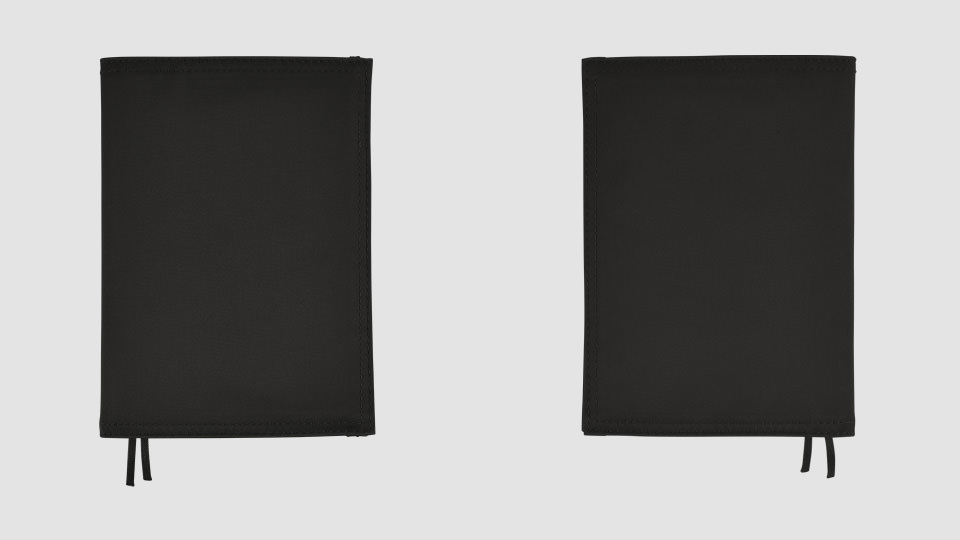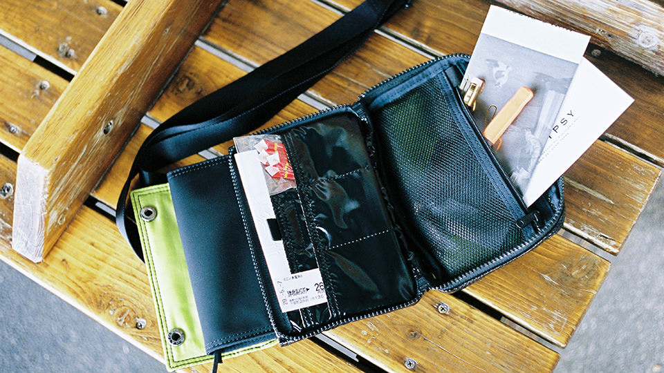 ペンホルダーを兼ねたタブで開くフロントのポケットは、