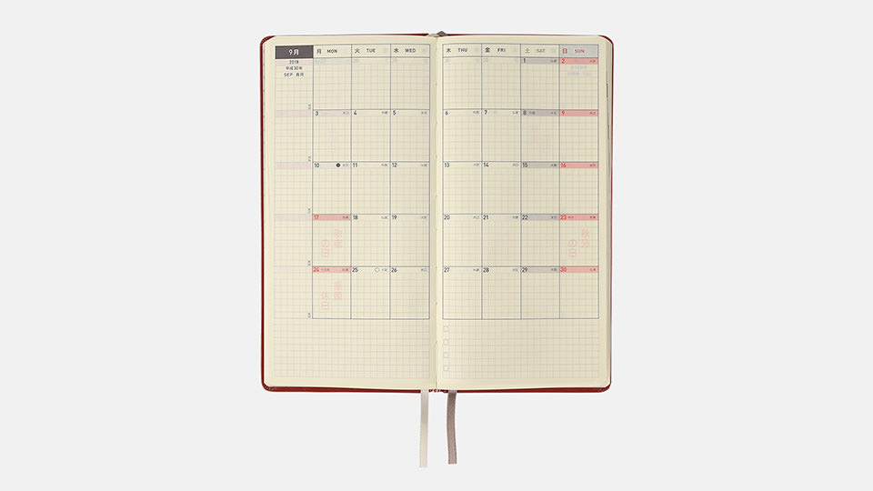 - 週番号/六曜(大安、仏滅など)/二十四節気(立春、春分、夏至など)/祝日、記念日など(バレンタインデー、ひなまつり、母の日、父の日など)/月の満ち欠け(週間ページ全てに記載・月間カレンダーに満月と新月のみ記載)