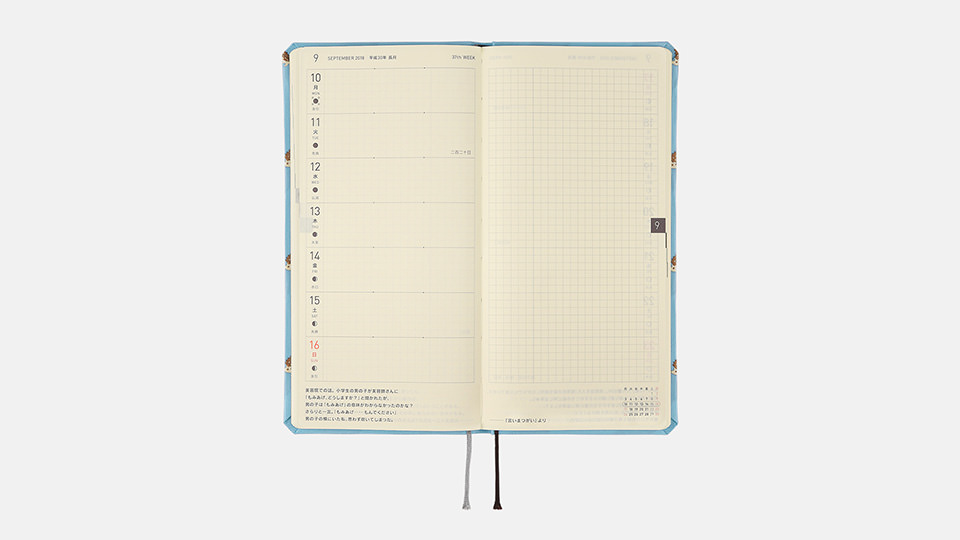 - 週番号/六曜(大安、仏滅など)/二十四節気(立春、春分、夏至など)/祝日、記念日など(バレンタインデー、ひなまつり、母の日、父の日など)/月の満ち欠け(週間ページ全てに記載・月間カレンダーに満月と新月のみ記載)
