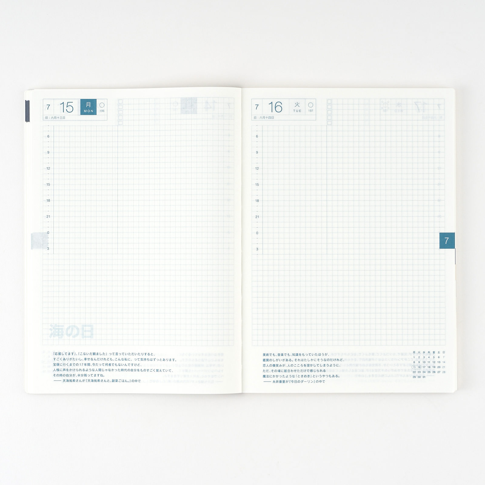 | 記載される内容 | 日番号/週番号(月間カレンダーに記載)/旧暦/六曜(大安、仏滅など)(月間カレンダーに記載)/二十四節気(立春、春分、夏至など)、雑節/祝日、記念日など(バレンタインデー、ひなまつり、母の日、父の日など)/月の満ち欠け(1日ページ全ページに記載、月間カレンダー・週間ダイアリーに満月と新月のみ記載) |
