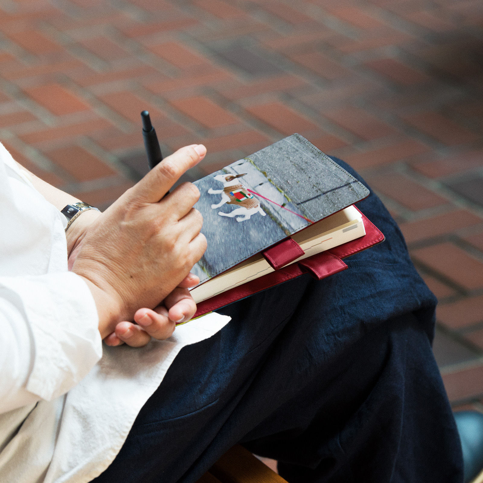 カバーの使いはじめは、ペンホルダー、またはバタフライストッパーの生地や革がかたいため、ペンが抜きさししづらくなっています。