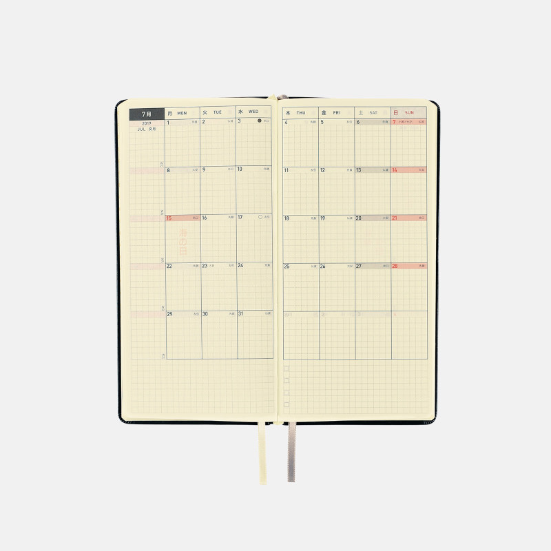 | 記載される内容 | 週番号/六曜(大安、仏滅など)/二十四節気(立春、春分、夏至など)/祝日、記念日など(バレンタインデー、ひなまつり、母の日、父の日など)/月の満ち欠け(週間ページ全てに記載・月間カレンダーに満月と新月のみ記載) |