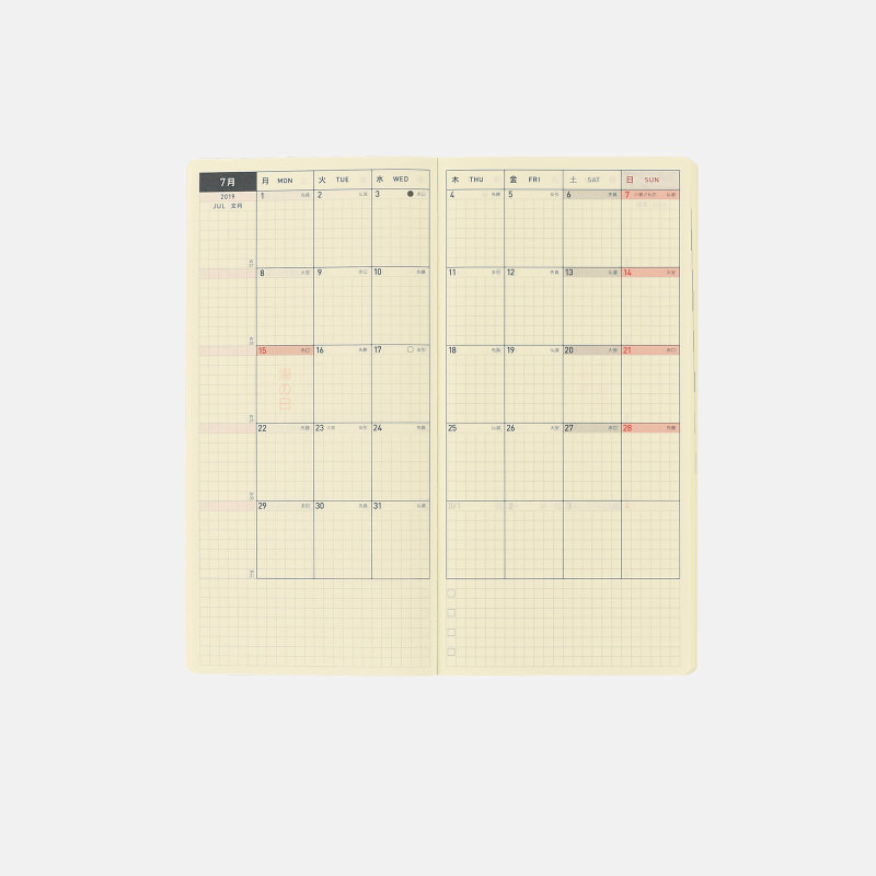 | 基本仕様 | 掲載期間:2019年1月~2019年12月 週の区切り:月曜はじまり ページ構成:週間ページ/月間ページ/おまけページ |