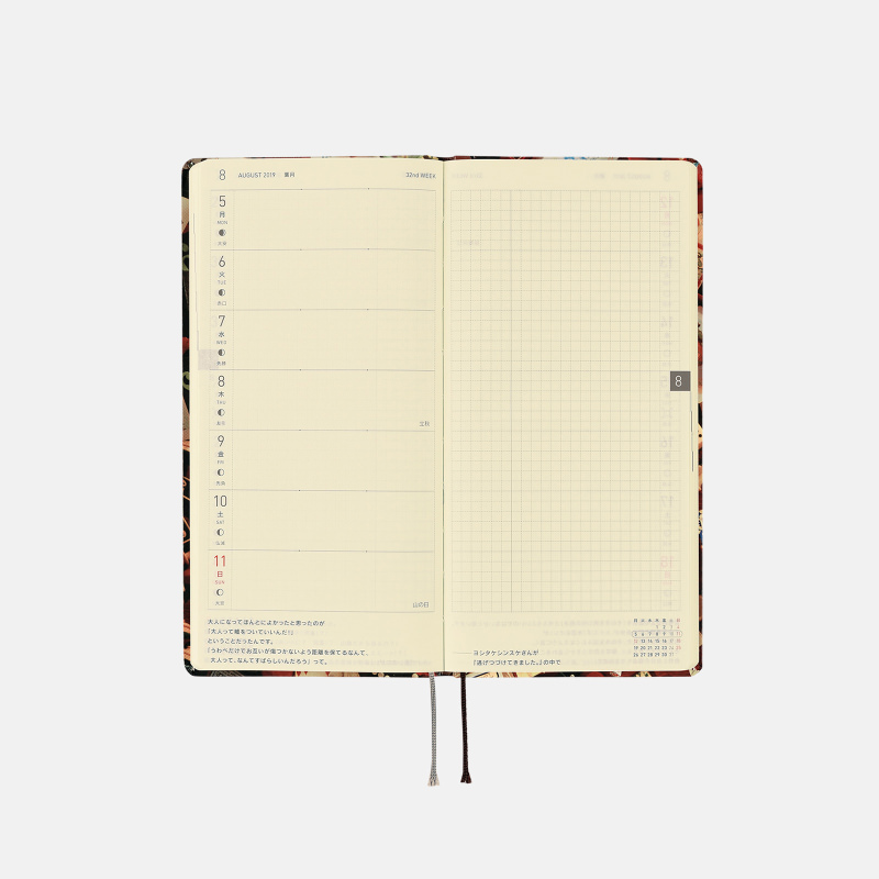 | 記載される内容 | 週番号/六曜(大安、仏滅など)/二十四節気(立春、春分、夏至など)/祝日、記念日など(バレンタインデー、ひなまつり、母の日、父の日など)/月の満ち欠け(週間ページ全てに記載・月間カレンダーに満月と新月のみ記載) |