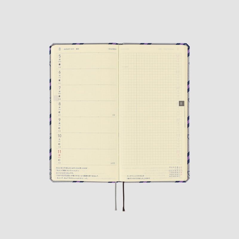 | 記載される内容 | 週番号/六曜(大安、仏滅など)/二十四節気(立春、春分、夏至など)/祝日、記念日など(バレンタインデー、ひなまつり、母の日、父の日など)/月の満ち欠け(週間ページ全てに記載・月間カレンダーに満月と新月のみ記載) |