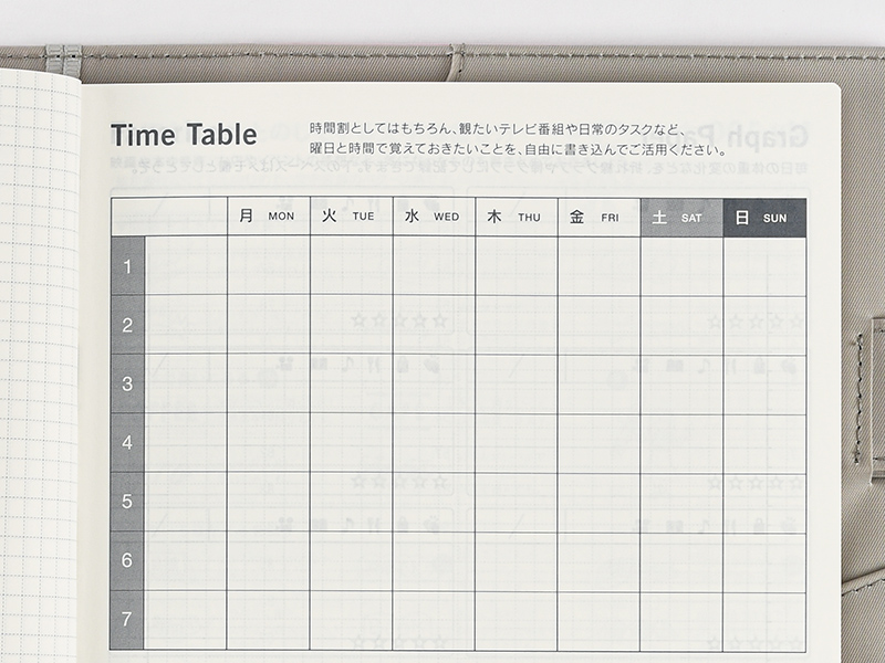 曜日ごとの決まった内容を書いておけるタイムテーブルを2つ収録。時間割やテレビ番組の放送時間、家事当番の分担など、テーマを決めて使うことができます。