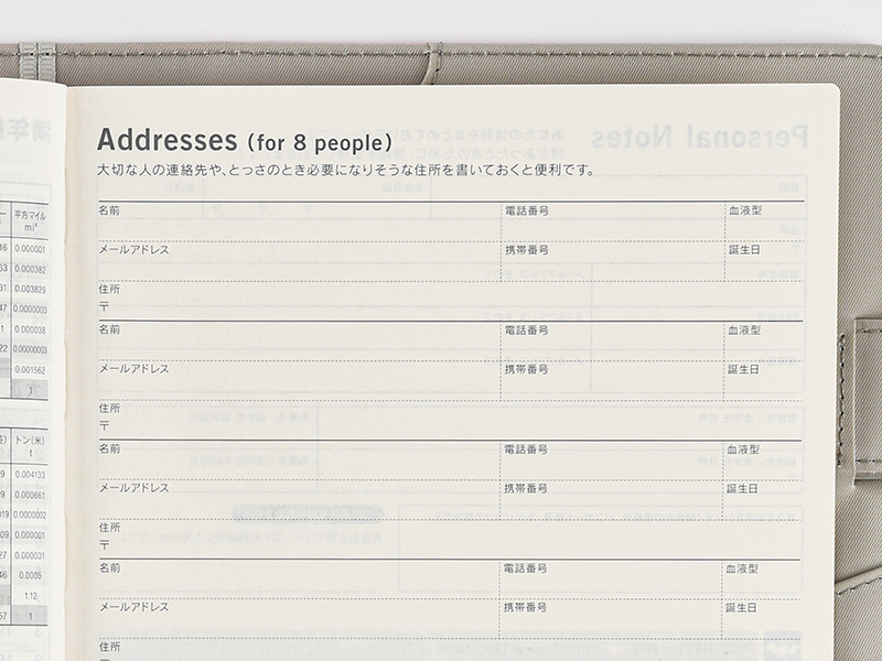 家族や友人の連絡先など、8名分の情報を書いておけるアドレス帳です。